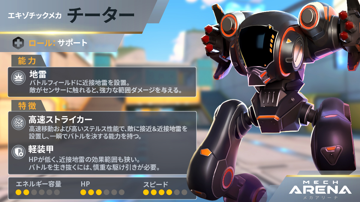 | 軽装甲 | HPが低く、近接地雷の効果範囲も狭い。バトルを生き抜くには、慎重な駆け引きが必要。 |