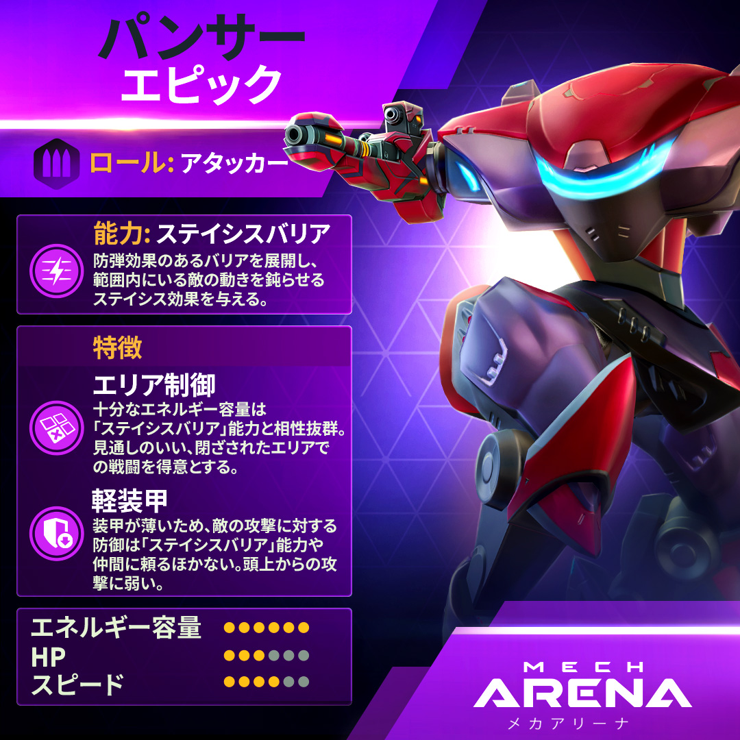 | エリア制御 | 十分なエネルギー容量は「ステイシスバリア」能力と相性抜群。見通しのいい、閉ざされたエリアでの戦闘を得意とする。 |