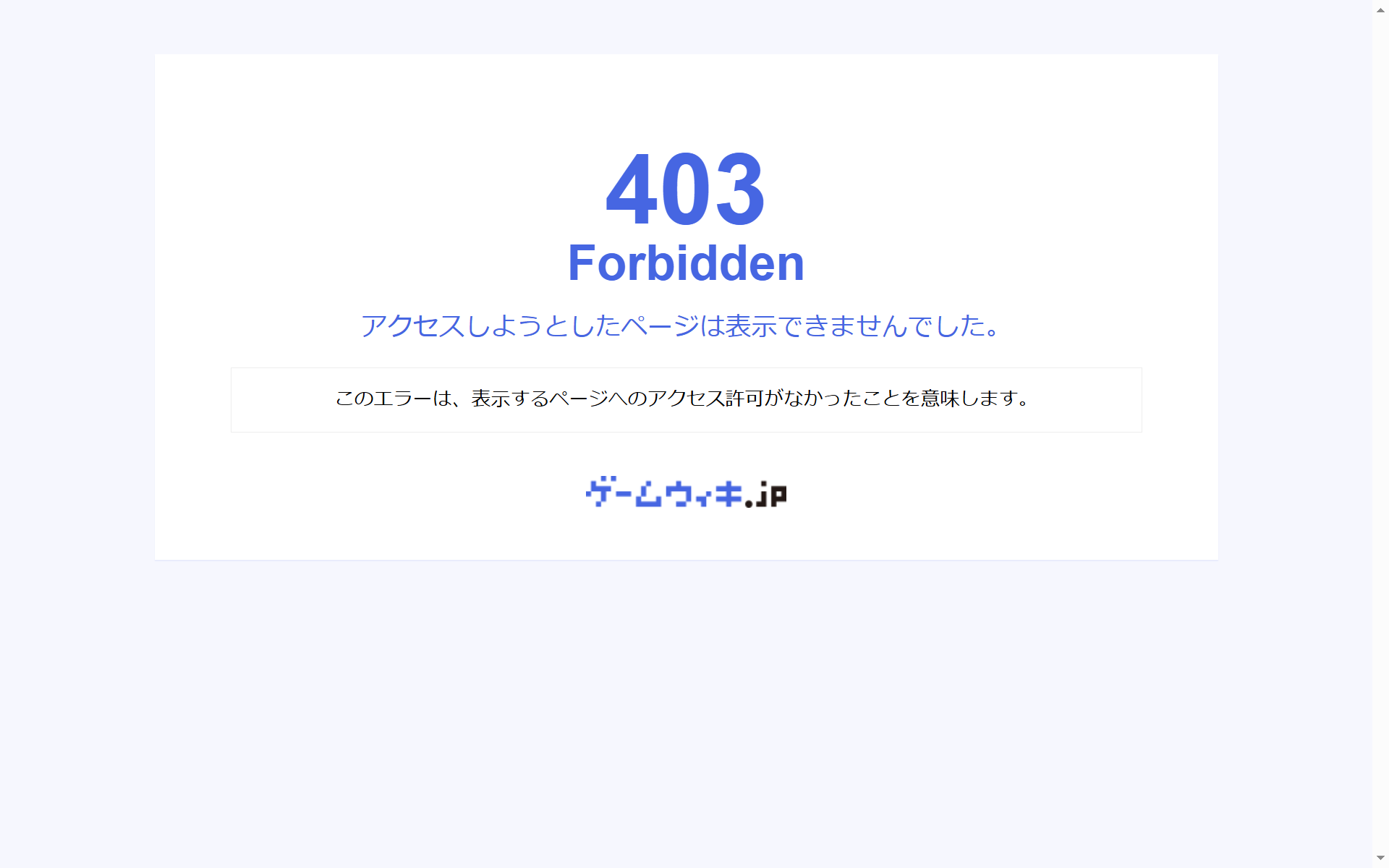 >>25 403 Forbidden これは、アクセス禁止を意味してます。 特に当サイトでは設定はしていないですが、作りかけなのと、ゲームウィキ.jpも末期なので、若干挙動は気に成りますね